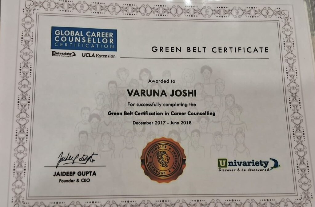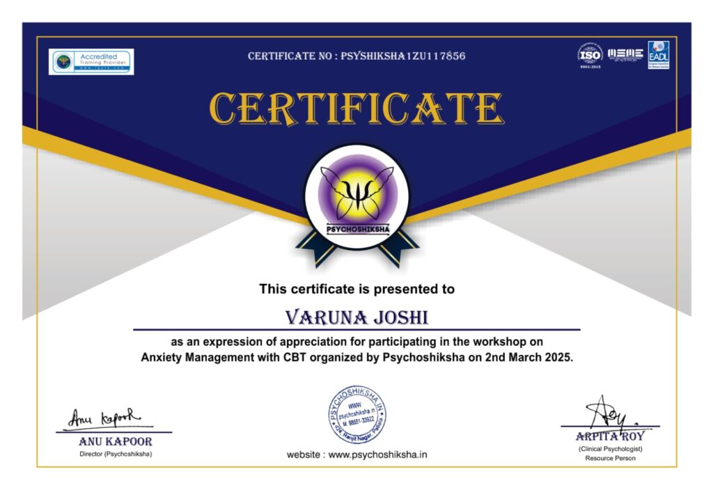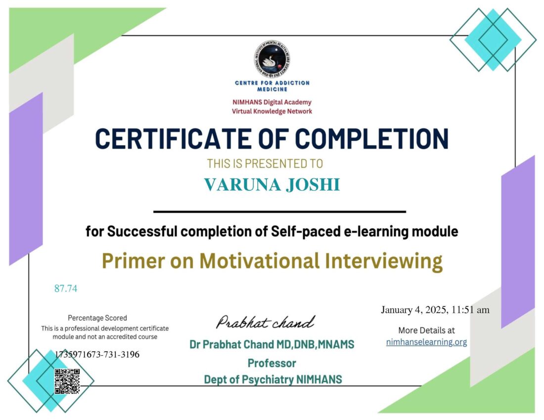 Ms. Varuna Joshi is a passionate and empathetic RCI-licensed Rehabilitation Counselor and Psychotherapist with over 5 years of clinical experience. Her expertise spans psychological assessment, therapeutic intervention and holistic counseling across a wide spectrum of individuals — including children with special needs, adolescents, young adults, working professionals, military personnel and their families, single parents, and the elderly.
