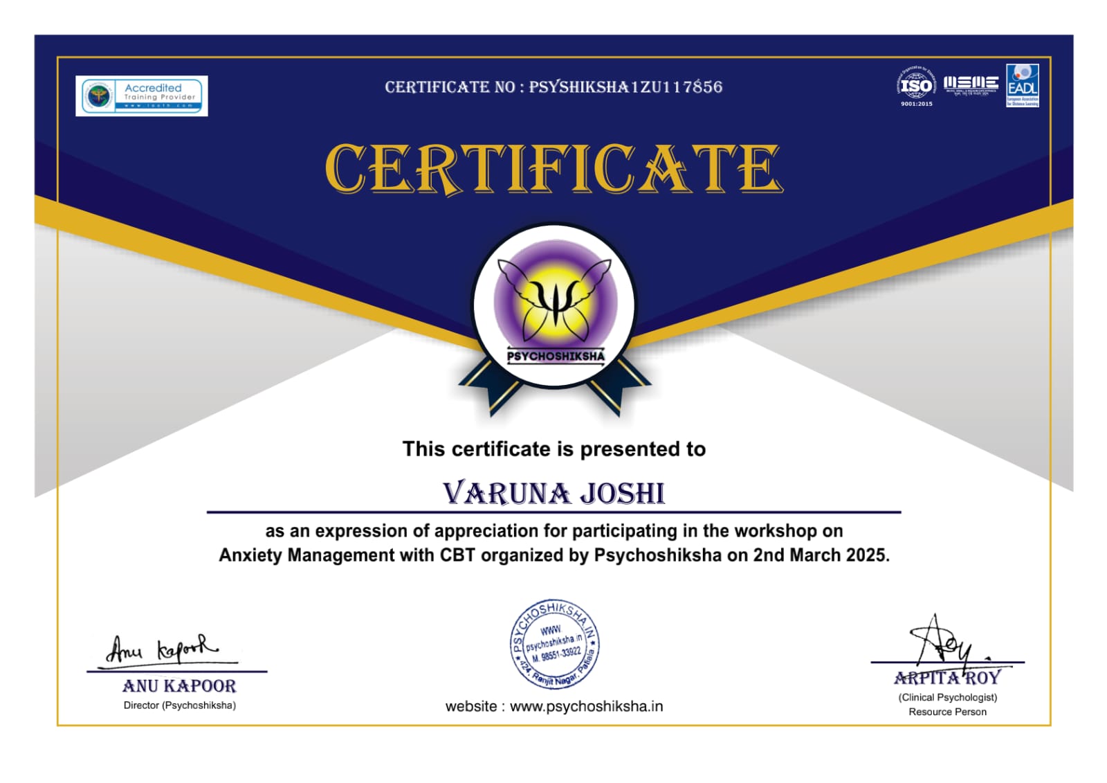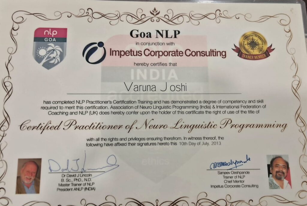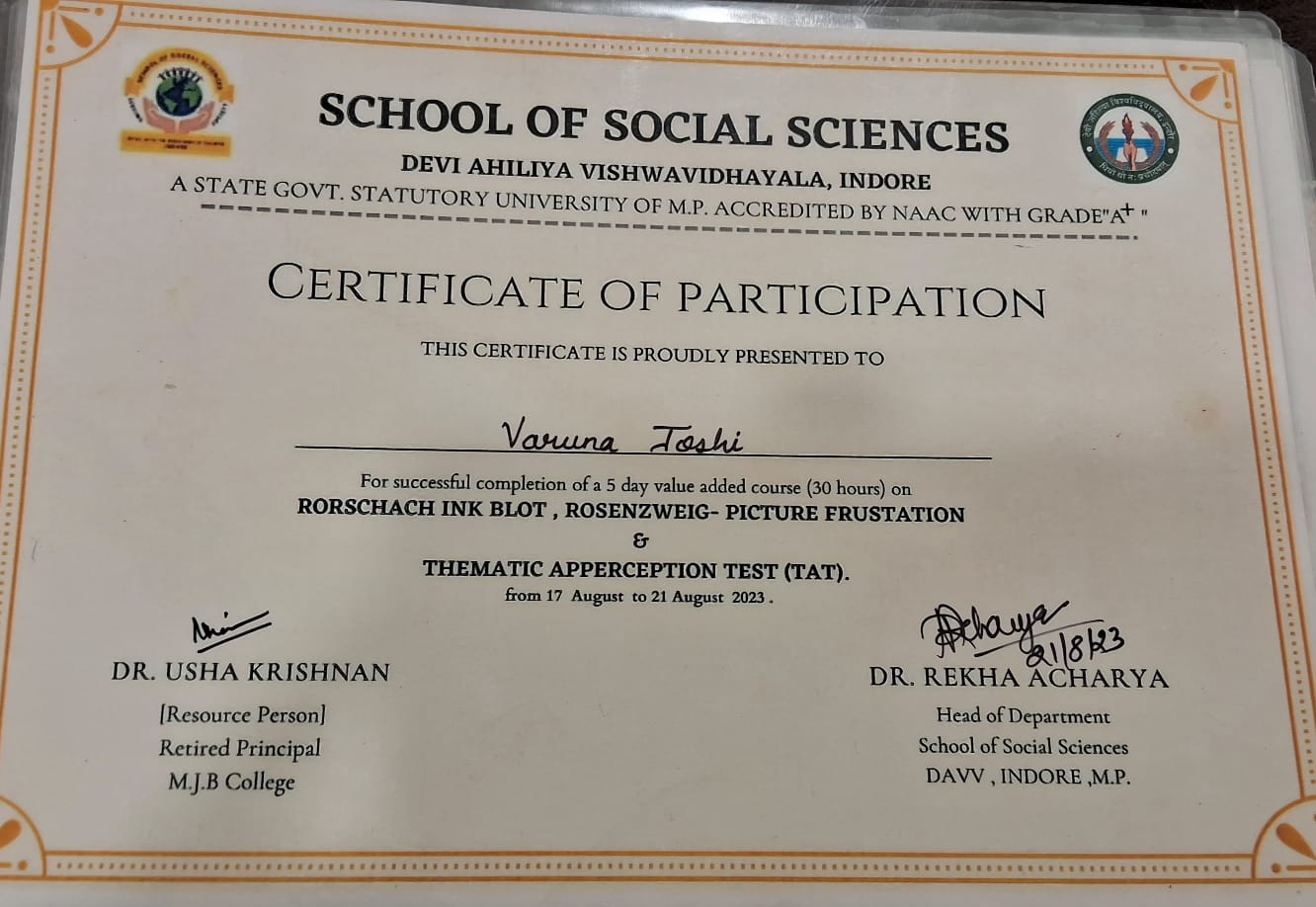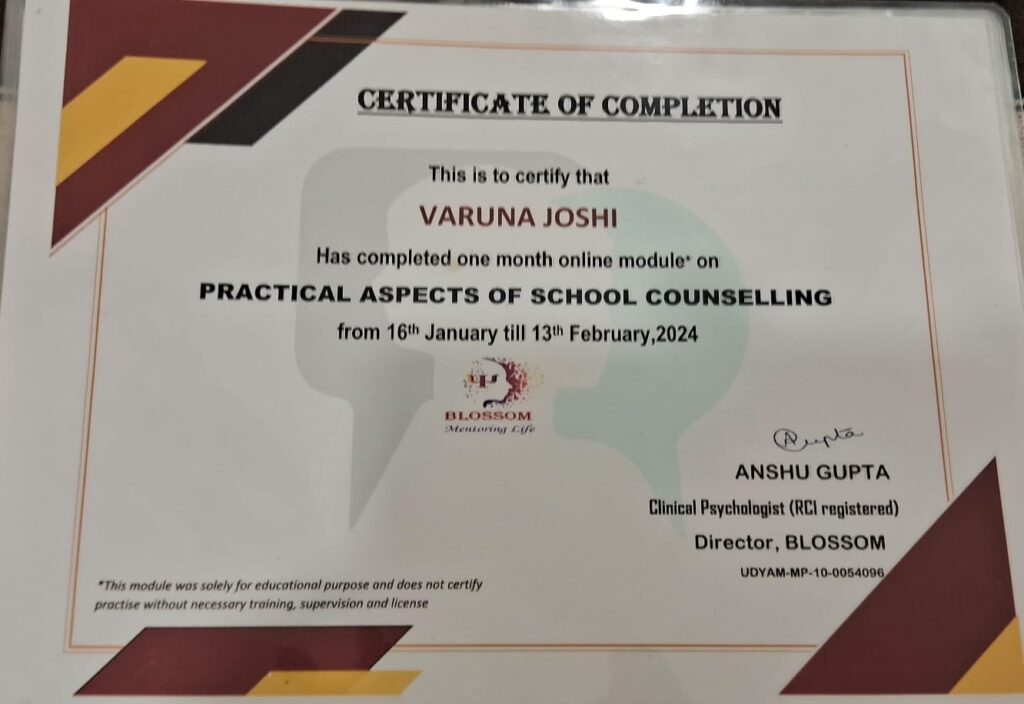 Ms. Joshi holds a Post Graduate Diploma in Rehabilitation Psychology from NIMHR, Sehore (M.P.), recognized by the Rehabilitation Council of India (RCI), with daily OPD experience during her training. Her academic qualifications also include a graduate degree in Information Technology, B.Ed, and Postgraduate degrees in English Literature and Psychology and Post Graduation Diploma in Guidance and Counseling.